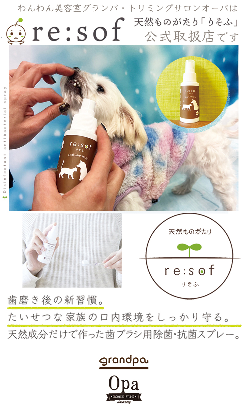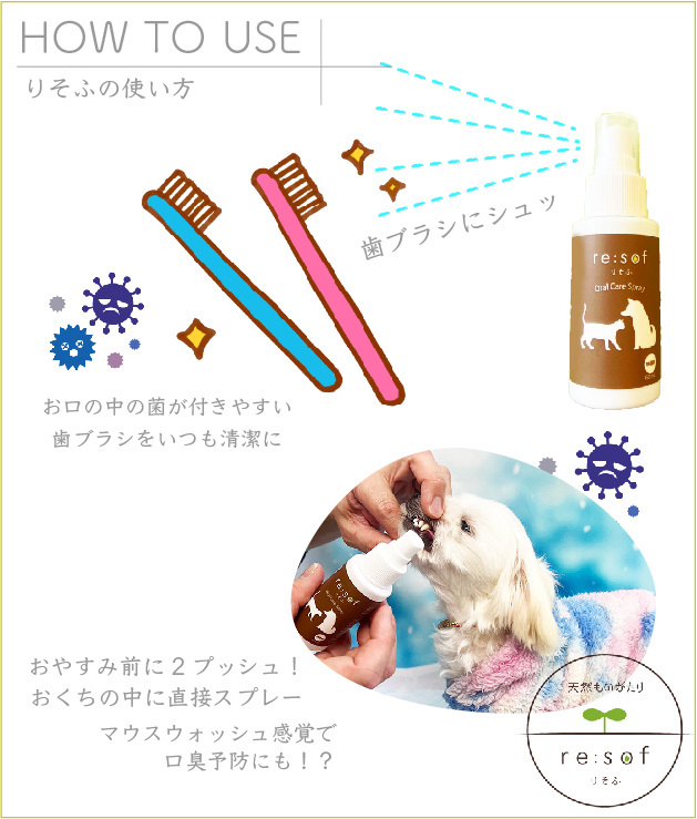 歯ブラシも除菌・抗菌する必要があります。りそふはシュッとスプレーするだけで除菌・抗菌が可能です。むし歯菌や歯周病菌など、お口の中にあって歯ブラシについてしまった細菌の除菌・抗菌はもちろん、犬チャンや猫ちゃんのお口に直接スプレーすることもできる歯科医師もオススメする安心安全な商品です。人の口内にも使用できるヒューマングレードのスプレーで大切なワンちゃん猫ちゃんの口内環境をより良いものへと保ちます。